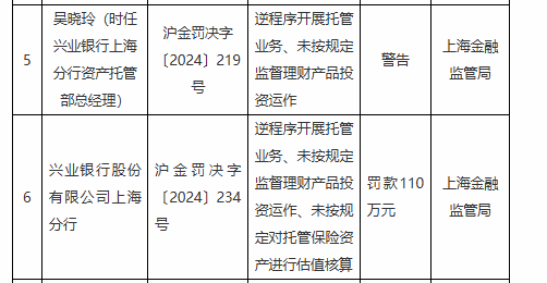 1月2日金融一线音问,国度金融监督惩处总局上海监管局行政处罚信息公开表清晰,兴业银行股份有限公司上海分行因逆秩序开展托管业务、未按规章监督答理居品投资运作、未按规章对托管保障金钱进行估值核算,被罚110万元。
